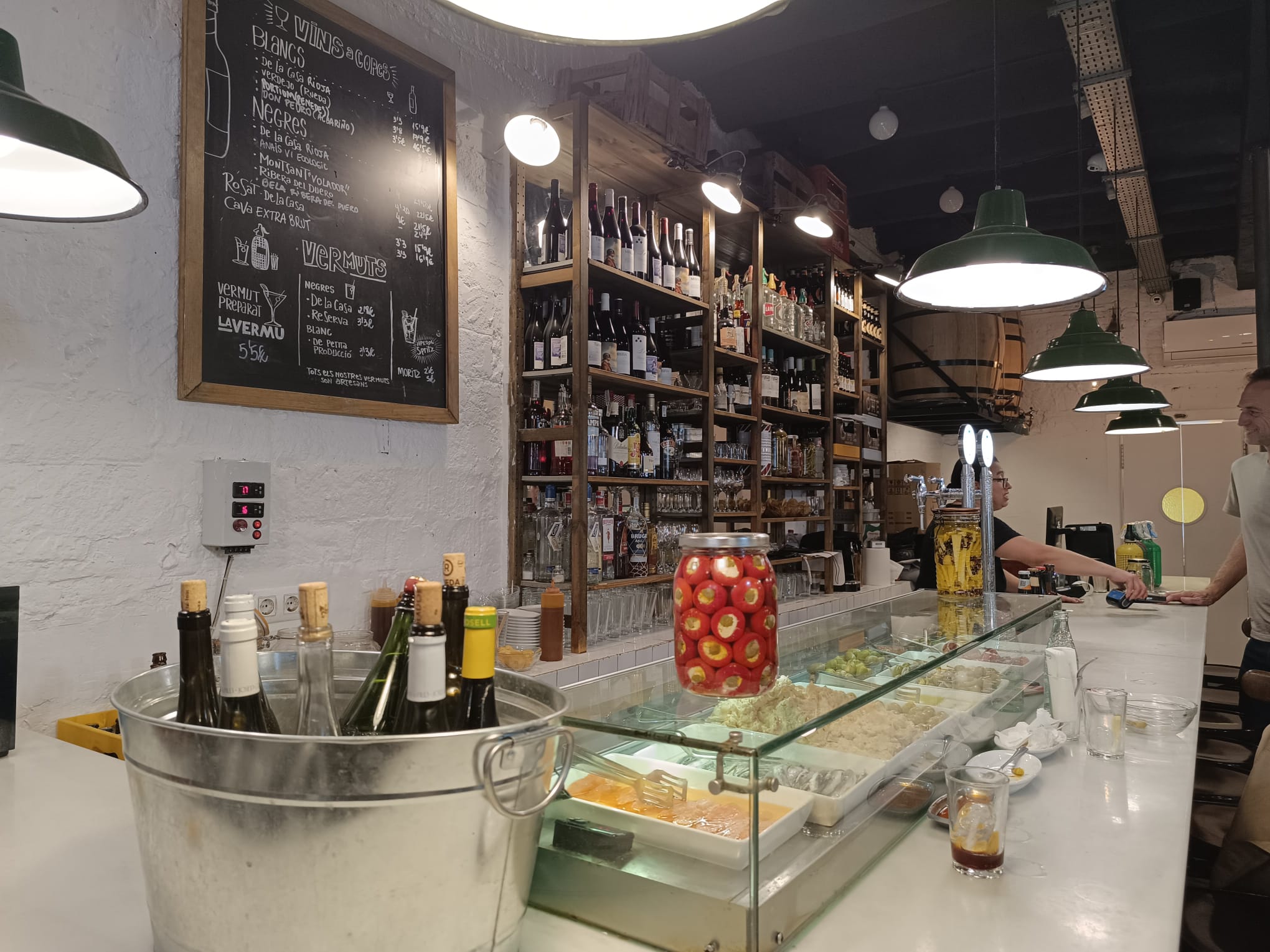 "Ir de vermut" has become a very popular trend in Barcelona. Vermut is a liqueur made from an artisanal blend of wine and aromatic herbs, but the concept of “hacer un vermut” or “going for a vermut” no longer refers only to the drink itself. It now includes the pinchos, olives, anchovies, crisps and other tapas and delicious small dishes that accompany it. It’s an aperitif you can enjoy standing or sitting, but always in good company. Many bars in the city have brought this tradition back and offer their own vermut recipes, competing in quality and flavour. Among all the options, we chose a small, cosy neighbourhood vermutería called La Vermu. It is located in the heart of Gràcia and is easy to recognise thanks to its distinctive red shutters. It was the first time we chose this place for our vermut, and we really enjoyed it. We’ll definitely be back!